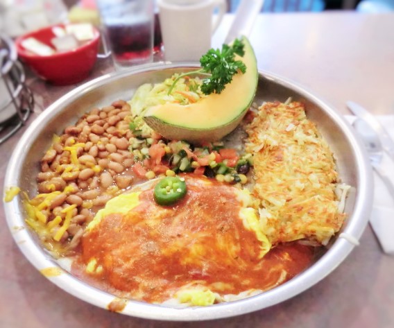 Peg’s Glorified Huevos Ranchero はここの定番メニューのメキシコ風朝食。Huevos Rancheroはスペイン語で「卵牧場」(直訳)です。薄いフライパン(スキレットと呼びます)に卵(目玉焼きやスクランブルなど好きな焼き方を注文時にリクエスト)、煮たピントビーンズ、ピコデガヨ(サルサ和えみたいなの)、キャベツサラダ、ハッシュブラウンが彩りよく盛られてフライパンごとどーんとサーブしてくれます。一皿でいろいろ食べられて嬉しい~!