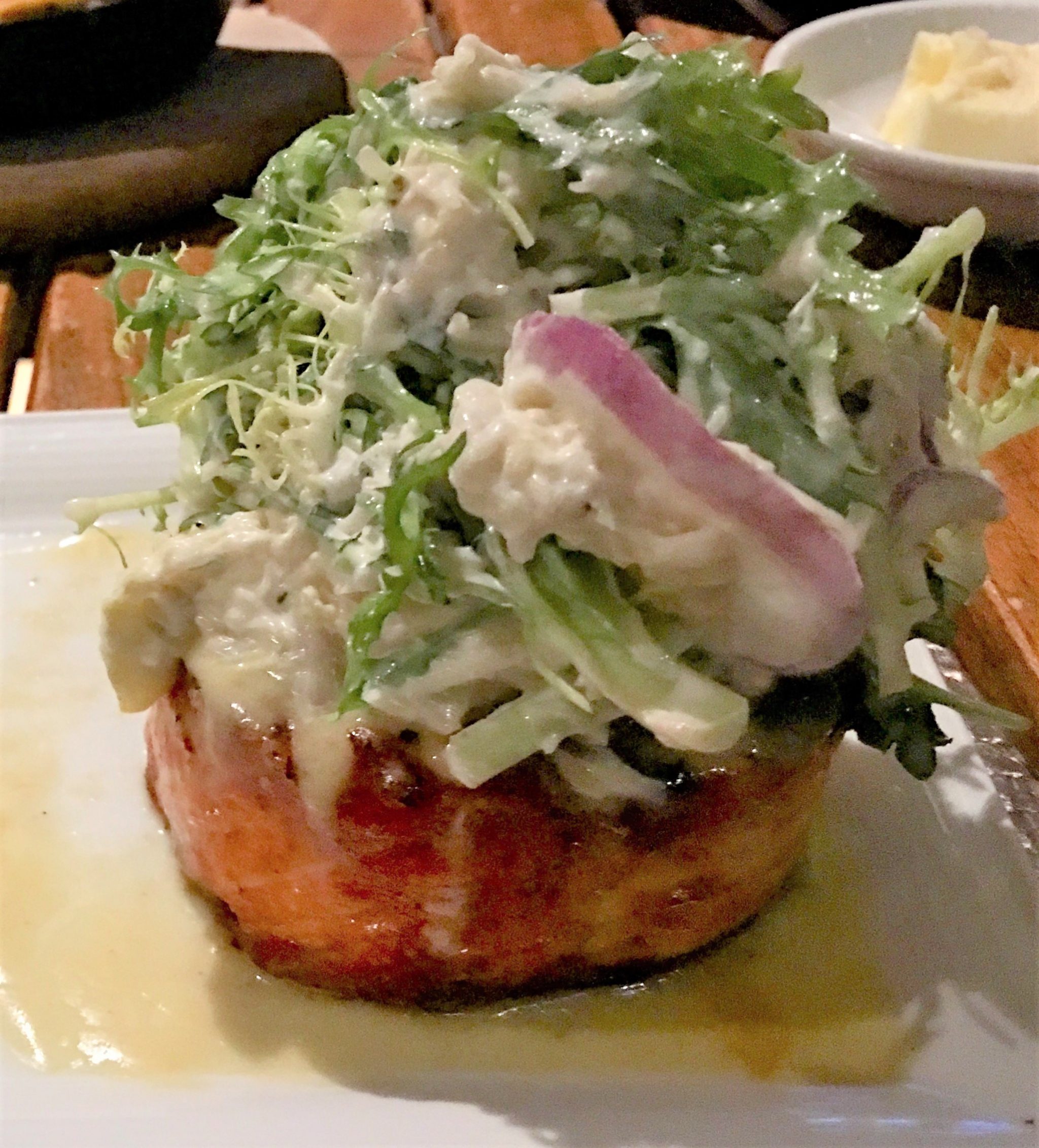 アペタイザ―はトマトスープとムール貝。トマトスープはひとつだけ注文しましたが、2人でシェアするの?とウエイトレスに聞かれたので、YESと答えたら2カップにちゃんと分けて持って来てくれ、なかなか気が利くなと感心。メインはサーモンの上に蟹サラダがのっかったものとバイソンのステーキ、サイドにポテト・グラタン。前半にパンを食べ過ぎたのでメインはすこぶる美味しかったけど完食出来ず半分お持ち帰り。お部屋に冷蔵庫があって助かりました。このレストランの名物デザート、ベイクド・タホ―(過去記事参照下さい)は残念ながらお腹いっぱいで頂けませんでしたのでまた次回のお楽しみに。