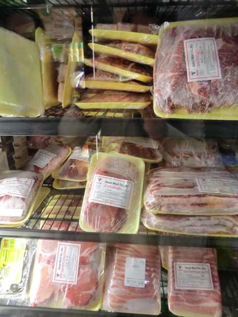 入って右手前奥はアジア系の野菜コーナー。レジまわりには季節の果物、冷蔵コーナーには茸類やもやし等があります。普通のアメリカのスーパーマーケットよりも安いものが多く見受けられます。野菜達は殆ど量り売りです。